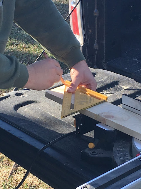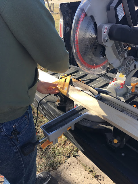 All we did was measure a side at a time on our windows. We had to do this because our house is so old, things have settled and become crooked over time so we figured the windows wouldn't be completely perfect and square and we were right. The sides were off by a tiny bit. Once you measure, you're going to take your board and your tape measure and mark the measurements on your board. BUT DON'T CUT YET! You will want to take your square and make a 45 degree line FROM the mark on your board so that the frame will be larger than the window. You'll end up with something like this